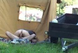 На городском мероприятии парочке приспичило потрахаться, и они спрятались за палаткой. Место оказалось не особо надежным, и пока девка прыгала на члене, за сексом подсмотрели, и засняли на камеру.